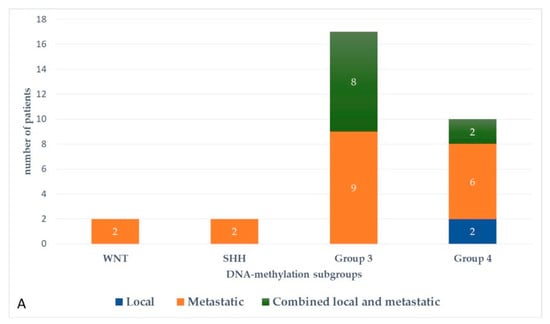 At the last follow-up, relapse or progressive disease occurred in 48 patients (31%) at a median time of 14.3 months (range, 1.2–87.2 months) after diagnosis. A biopsy or surgical resection of the tumor was performed in case of focal relapse, in the context or molecular screening programs (precision medicine in the field of pediatric oncology) or in ambiguous cases. Table 1 describes the initial characteristics of the patients with relapsed MB. Compared to patients without relapse, patients with relapsed MB were generally younger than 5 years (p = 0.0115), with Group 3 MB (p = 0.0475) and had a MYC/MYCN amplification (p = 0.0248). The pattern of relapse was local in 9 cases, metastatic in 22 and combined local and metastatic in 17. Although all patients of Group 3 MB showed evident metastatic dissemination at relapse, no statistical association was found between molecular subgrouping at diagnosis and individual relapse patterns, i.e., local, metastatic only and combined, local and metastatic (p = 0.0769, Fisher’s exact test). However, when patients with metastatic relapse and those with both local and metastatic relapse were grouped together, a significant general association between molecular subgrouping at diagnosis and the pattern of relapse was observed (p = 0.0348) According to the first-line treatment (RT-based regimen vs. CT alone), there was a statistically significant difference in pattern of relapse (p = 0.007, Fisher’s exact test) with a higher proportion of local relapse in patients treated with chemotherapy alone, especially in SHH MB and Group 4 MB. Nearly all relapses were metastatic among the different molecular subgroups after receiving upfront RT (Figure 3).