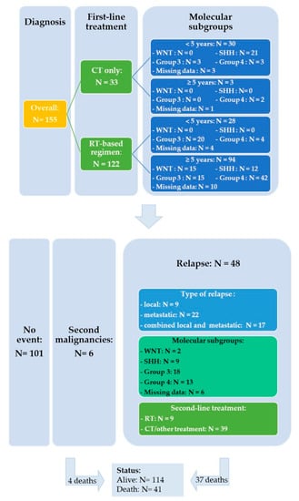 Salvage treatment modalities were selected according to initial treatment and on case-to-case basis. Fifteen out of 48 patients were able to undergo resection or biopsy of the relapsing tumor which involved local recurrence in nine cases and metastatic sites in six. Among the 35 patients who received upfront RT, re-irradiation was administered in three patients with (n = 1) or without chemotherapy (n = 2), two patients received an SHH-inhibitor (Table S1: patient # 43 was initially considered as SHH MB according to IHC and subsequently categorized as Group 3 by DNA methylation), 26 were treated with chemotherapy and four patients did not receive further treatment. Thirteen patients progressed or relapsed after treatment based on chemotherapy alone: three received an SHH-inhibitor, four salvage chemotherapy and six patients RT with (n = 3) or without chemotherapy (n = 3). The detailed characteristics of the 48 relapsed patients are shown in the Table S1. Figure 4 represents a flowchart of the entire study cohort.