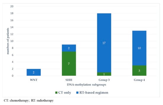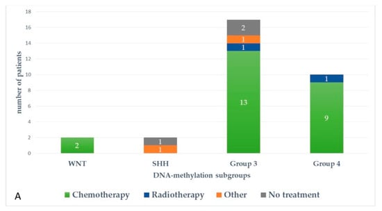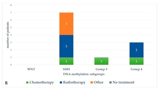 Figure 5 and Figure 6 represent upfront treatment according to DNA-methylation subgroups in patients with relapsed medulloblastoma (Figure 5) and treatment at relapse according to DNA-methylation subgroups in patients with relapsed medulloblastoma after receiving upfront radiotherapy-containing regimen and chemotherapy only (Figure 6).