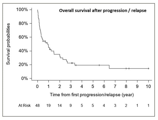 The median follow-up for patients with relapse/progression was 5.6 years (range, 0.5–10.0 years). The median OS from first relapse/progression was 0.91 years (CI 95%, 0.31–1.49 years) (37 deaths), with an estimated 1-, 2- and 5-year OS rate from first relapse of 44.8% (CI 95%, 31.5–59.0%), 32.5% (CI 95%, 20.5–47.3%) and 19.3% (CI 95%, 9.9–34.0%), respectively (Figure 7).