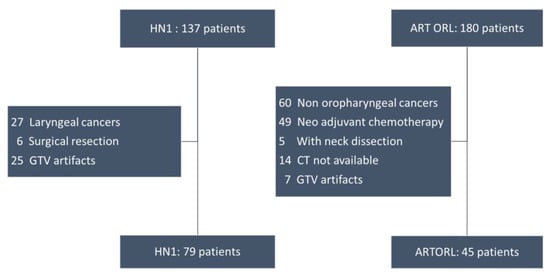 In HN1, 79 patients had an oropharyngeal cancer and were included in the training cohort. We faced patient attrition in the ART ORL cohort (Figure 1).