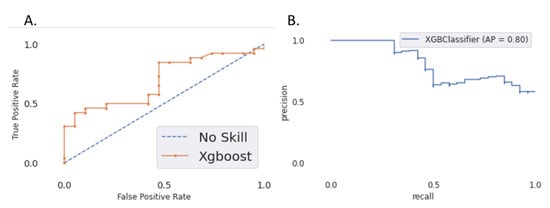 The XGBoost model was trained using “mean average precision” as eval_metric and “precision” for optimization. The hyperparameters obtained after optimization are detailed in Appendix B. It yielded a precision (predictive positive value) of 0.92 in the test set with only one false positive (falsely classified as relapse). The recall (sensitivity) was 0.42, and the AUC of the ROC curve was 0.68. The AUC of the precision–recall curve was 0.79 (Figure 3). The accuracy was 0.64.