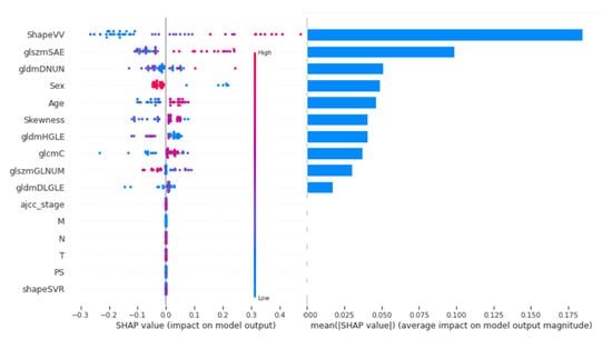 The Shapley Value comes from game theory [,,]. It is the assessment of the contribution of each variable of the model to its output (or prediction in our case). For a variable of interest, the output of each possible combination of other variables is collected. The difference between the average of all those possible outputs without the variable of interest and the model’s output when including the variable of interest is the Shapley Value of the variable. This allows one to quantify the impact of each variable on the prediction not only on a global level (on the overall population) but also locally (on a subset or one patient). Thus, it does not provide the importance of each feature to the loss function decrease but to the prediction result. Shapley Values for each variable are thus additive, which makes the contribution of each variable convertible to a share of the output classification probability. This provides an intuitive visualization for clinicians if this model should ever be used. The shap package developed by Lundberg [] was used with TreeExplainer to compute Shapley Values and provide global and local explanatory visualization.