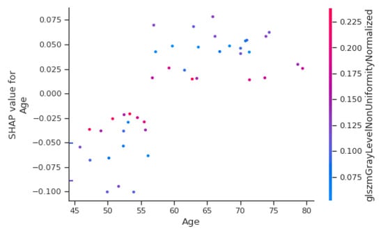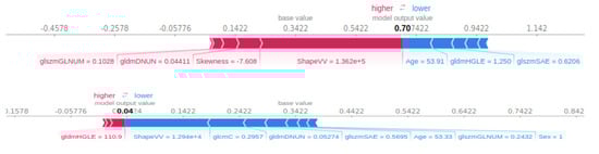 Below 57 years, the value is negative and thus appears to diminish the output probability, while above, the age contributes to the increase of the output. However, in the case of a high value of gldmGLNUN, the Shapley Value of age appears to tend towards zero. As a result, a high heterogeneity may take over the importance of age for the contribution to the output. All the features’ contribution to the output can be plotted for one single patient. For instance, in Figure 6, shape Voxel Volume (shapeVV) contributes to the increase in the predicted probability for progression, while a ten-times lower shapeVV contributes to a decrease in the predicted progression probability. In both cases, as seen previously, the age is below 57 and contributes to a diminished output probability.