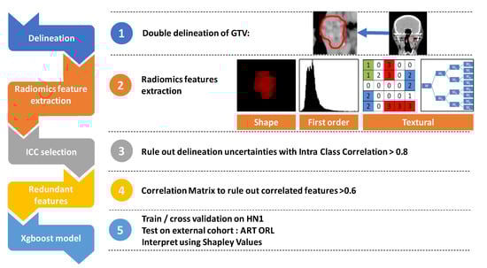 Two contours of the GTV were made, each by a radiation oncologist blinded from the other’s delineation. Although acquisition parameters are known to influence radiomic features, metadata on acquisition parameters of HN1 were not available, so we could not assess the training cohort CT acquisition variability []. However, in the validation cohort (ART ORL) we had a homogenous tube voltage and section thickness. The X-ray tube current was variable (from 40 mA to 445 mA), as was the kernel convolution used (Appendix D). Spatial resampling was not performed prior to extraction. Radiomic features were extracted in a 3D fashion from each contours using Pyradiomics []. GTV ROI used for extraction were of sufficient size, ranging from 1.9 cm3 to 234 cm3 for HN1 and from 2.3 cm3 to 136.2 cm3 for ART ORL (Appendix E). Radiomic feature filtering was performed on the training cohort (HN1). First, only reproducible features between contours were kept to rule out features depending on delineation uncertainties as described by several authors [,,]. Intraclass correlation above 0.8 was required for features between each contour. A correlation matrix of the remaining 42 radiomics features was used to avoid feature redundancies (Appendix F). If two features had a correlation of more than 0.6, one of them was removed. Figure 7 shows the workflow.