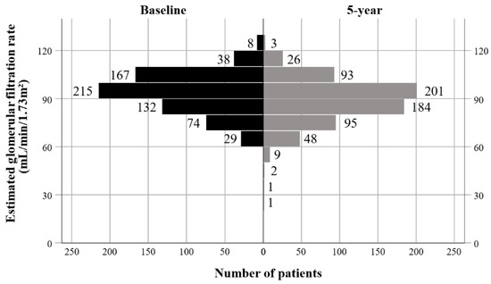 Histogram of baseline and five-year estimated glomerular filtration rates.
