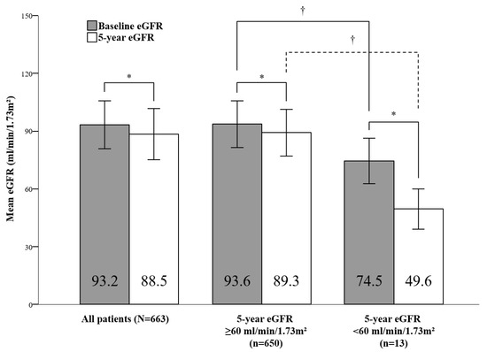 Comparison of baseline and five-year estimated glomerular filtration rates; eGFR, estimated glomerular filtration rate. * Paired t-test, p < 0.001; † independent-sample t-test, p < 0.001.