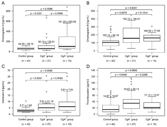 CgB was significantly higher in the CgA− group (p = 0.0070), compared to the control subjects, while the CgB level of CgA+ patients did not differ from the level in either the control (p = 0.8037) or the CgA− groups (p = 0.1014; Figure 1B). Similar to CgB, the thrombopoietin level was only significantly different in the CgA− group (p = 0.0040; Figure 1D). Plasma interleukin-6 levels of both CRC groups was significantly higher, compared to those in the control group (CgA−: p = 0.0037, CgA+: p = 0.0090), but did not differ between the tumor cohorts (p = 0.9483; Figure 1C).