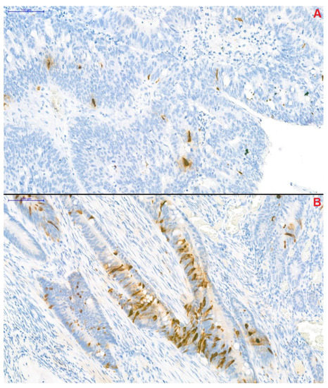CgA-specific immunohistochemical staining of resected tumor segments was carried out with the Clone DAK-A3 Monoclonal Mouse Anti-Human Chromogranin A kit (M0869, dilution 1:1000; Dako Denmark A/S, Glostrup, Denmark). CgA-positivity was defined as previously described by Gulubova and Vlaykova [12]. Adenocarcinoma samples, in which anti-CgA-stained cells infiltrated beyond the muscularis mucosae were defined as CgA-positive. Two well-distinguishable patterns were observed: (1) CgA-positive cells were located randomly and individually or (2) the presence of a grouped pattern was observed in the remaining samples (Figure 3). Samples were blind-examined—the pathologist performing the immunohistochemistry was unaware of clinical and survival data of patients.
