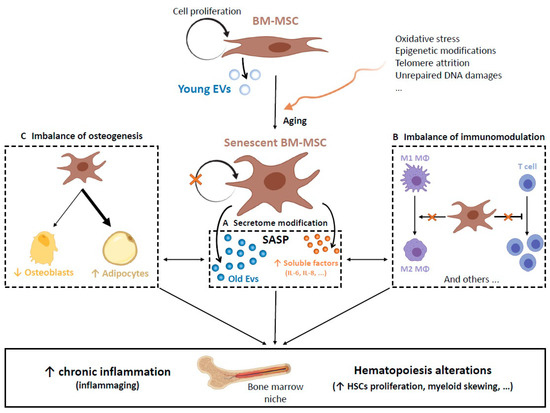 With aging, several factors induce the senescence of bone marrow mesenchymal stromal cells (BM-MSCs) that accumulate inside the bone marrow (BM) niche. (A) The senescent BM-MSCs adopt the senescent-associated secretory phenotype (SASP) enriched in particular with proinflammatory cytokines, and their extracellular vesicle (EV) morphology and content are strongly modified (see Section 2.1). (B) The immunomodulatory properties of aged BM-MSCs are impaired. For example, their ability to promote macrophage (MΦ) polarization into the M2 phenotype and their capacity to inhibit T lymphocyte proliferation are reduced (see Section 2.2). (C) An imbalance between osteogenesis and adipogenesis occurs, leading to a progressive replacement of bone by fat (see Section 2.3). All of these processes are closely interconnected and can lead to the establishment of low-grade chronic inflammation and hematopoiesis alterations (Figure created with BioRender).