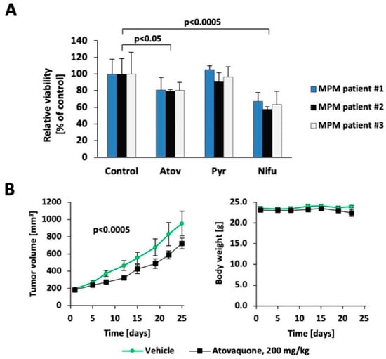 3D cell culture models are thought to more closely mimic in vivo tumor physiology, including greater resistance to therapeutic agents. We found that atovaquone, pyrimethamine, and nifuroxazide all led to differential effects on MSTO-211H cells compared to nontransformed LP9 cells in 3D culture (Figure S7A,B), even though the same concentrations were toxic in monolayer culture settings (Figure 2A). We then tested the three drugs in three freshly isolated primary patient specimens and normalized the results to control-treated viable cells (Figure 3A). Under these experimental conditions, both atovaquone and nifuroxazide significantly reduced growth in primary cells, whereas pyrimethamine did not. Finally, the two United States Food and Drug Administration (FDA)-approved drugs atovaquone and pyrimethamine were tested in vivo, using xenografts in NOD/SCID IL2Rγ−/− (NSG) mice. In this model, tumor fragments from an earlier established model with low passage primary-derived MS4 cells were used and implanted in new mice. Tumor growth was followed for 25 days and showed a 38% reduction in tumor mass growth in the atovaquone-treated animals, using a once daily oral dosing regimen equivalent to standard human dosing (p < 0.0005) (Figure 3B, left). Reflecting the fact that atovaquone is extremely well-tolerated in humans, treatment itself did not alter the body weight of the mice (Figure 3B, right). Similar to atovaquone, pyrimethamine also significantly reduced tumor growth (p < 0.05), but, as expected from the in vitro data, the changes were smaller (Figure S7C).