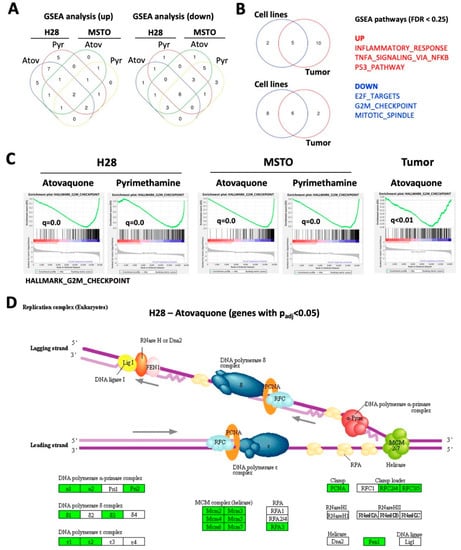 Atovaquone and pyrimethamine regulate pathways involved in cell growth. RNAseq data from H28 (n = 2), MSTO-211H (MSTO) (n = 2) or MS4 mouse tumors (n = 4) treated for 24 h with either pyrimethamine (10 mM), atovaquone (30 mM) or vehicle were used. (A) Gene Set Enrichment Analysis (GSEA) pathway analysis was performed to identify pathways that were upregulated or downregulated in treated cell lines. The Venn diagram indicates the number of common pathways in the various models (FDR < 0.25). (B) GSEA pathways that were identified in at least three cell line models were compared to GSEA pathways identified in atovaquone-treated MS4 tumors (FDR < 0.25). The Venn diagram identifies the number of common pathways and the three most prominent pathways are indicated. (C) Enrichment plots of the Hallmark G2M checkpoint pathway and q-values (FDR approach) for each model are shown. (D) Significantly changed genes (fold change >2 or <0.5; p < 0.05) in atovaquone-treated H28 cells were analyzed for their enrichment in the “replication complex (eukaryotes)” pathway using Pathview (upregulated genes—green, downregulated genes—red).