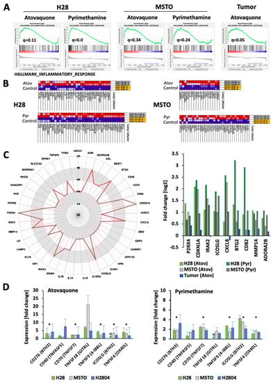 Atovaquone and pyrimethamine regulate immune pathway genes. (A) Enrichment plots of the Hallmark Inflammatory Response pathway and q-values (FDR approach) for different models treated with STAT3 pathway inhibitors, as indicated. (B) Enriched genes within the Hallmark Inflammatory Response pathways in H28 and MSTO-211H (MSTO) treated with either atovaquone (30 mM) or pyrimethamine (10 mM) are shown (upregulated genes—blue, downregulated genes—red). (C) Genes with the Hallmark Inflammatory Response pathway that are present in at least two of the five models are shown and scored according to their presence in each model (left). The relative changes in RNA expression in response to atovaquone (Atov) or pyrimethamine (Pyr) for genes that are present in at least four models are indicated (right). (D) The expression of additional immune pathway genes in response to 30 μM atovaquone or 10 pyrimethamine for 24 h in H28, MSTO-211H (MSTO) or H2804 cells was determined by RT-PCR (* significant differences with p < 0.05).
