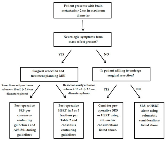 Herein, we will review the recent developments in novel radiation and surgical treatment paradigms for managing large brain metastases and provide strategies for delivering SRS or hypofractionated stereotactic radiation therapy (HSRT) for a variety of clinical scenarios. For the purpose of this paper, we will define large brain metastases as >2 cm in maximal diameter but recognize that this definition is controversial and not universally accepted.