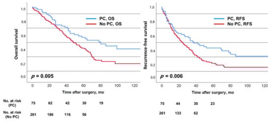 Median OS and RFS for the entire study population were 51 and 26 months, respectively. The corresponding 5-year survival rates were 57% and 42%. Patients with PC were observed to have better median OS (78 vs. 47 months, p = 0.005) and RFS (36 vs. 23 months, p = 0.006) compared to patients without PC, with 5-year survival rates of 57% vs. 43% (OS) as well as 42% vs. 21% (RFS), respectively (Figure 1).