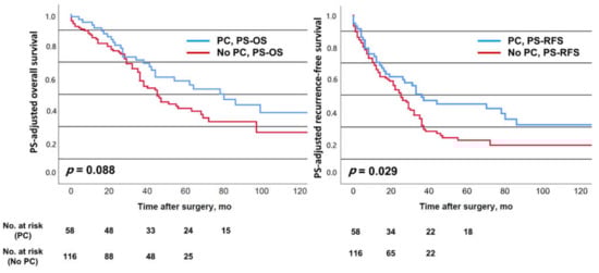 No significant differences were observed for EBL, although there was a trend of less EBL in the PC-group (median of 500 mL vs. 800 mL in the no-PC-group, p = 0.206). While the overall transfusion rate was comparable between PS-PC-patients and PS-no-PC-patients (35% vs. 40%, p = 0.619), the number of those receiving more than four units of blood was significantly lower in the PS-PC-group (>2 units: 9% vs. 21%; p = 0.052; >4 units: 2% vs. 11%, p = 0.037). Results of the PS-adjusted survival analysis are shown in Figure 2.