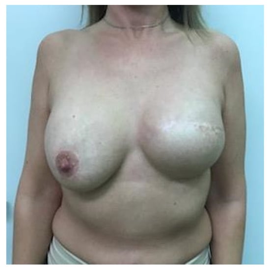 It has been shown that 84% of early-stage breast cancer patients can achieve disease-free survival of 10 years with a combination of multidisciplinary treatments [11]. Therefore, breast symmetrization surgery should provide long-lasting results, especially if one-stage IBR and contralateral symmetrization are performed. Ageing, changes in body weight (e.g., weight gain in the context of up to 10 years of endocrine therapy), stretching of tissues, biomechanical changes after implantation, postirradiation fibrosis, and/or different degrees of breast lymphedema may necessitate further and sometimes repeated reconstructive and symmetrization procedures (re-mastopexy, autologous fat grafting on the mastectomy or symmetrization side, minor corrections, capsuloplasty), in combination with additional physical and emotional burdens for patients as well as costs and caseloads for health systems. Another possible reason for the significant decrease in breast symmetry is the fact that over time, the natural breast develops differently than the reconstructed breast. The shape of the reconstructed breast remains constant 3–6 months after IPMBR because of the fixed volume and shape of the silicone implant, which dominates the breast with a thin overlying soft tissue layer. Due to the clearly different biological properties (e.g., gravity causes ptosis of the uplifted breast after mastopexy, upper pole flattening, lower pole expansion (pseudoptosis), hormone therapy may increase the volume of the natural breast, while the implant-based reconstructed breast does not show the same change, progressive capsular contracture on the mastectomy side, nipple flattening, nipple tattoo fading), the two breasts become increasingly different with time, resulting in asymmetry and decreased patient satisfaction, see Figure 1.
