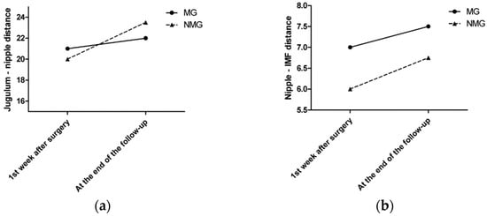 The median sternal notch-to-nipple distance difference from the symmetrization surgery to the last follow-up was 1 cm in the MG and 3.5 cm in the NMG. The median nipple-to-IMF distance difference from the symmetrization surgery to the last follow-up was 0.5 cm in the MG and 0.75 cm in the NMG (Figure 3a,b).