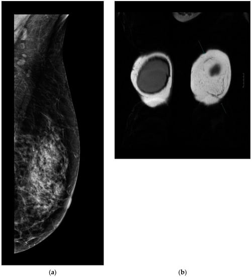 Every patient underwent control complex breast imaging (mammography as well as breast and axillary US) according to the ESMO guidelines for treatment and follow-up. Breast MRI was performed in 32 patients: 17 in the MG and 15 in the NMG. According to the control breast imaging examinations, the mesh did not disturb the clear visualization or oncological control of the underlying parenchyma (Figure 4a,b).