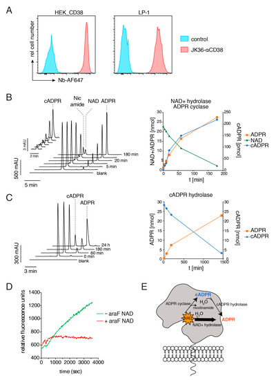 CD38-expressing tumor cells display potent NAD+ hydrolase activity and weak ADPR cyclase and cyclic-ADPR hydrolase activities. (A) HEK cells stably transfected with human CD38, untransfected HEK cells, and human LP-1 multiple myeloma cells were analyzed for cell surface levels of CD38, by incubation with Alexa647-conjugated CD38-specific nanobody JK36, before analysis by flow cytometry. (B,C) LP-1 cells were incubated at 37 °C in the presence of 500 μM NAD+ (b) or cADPR+ (c). The reaction was stopped at the indicated time points and NAD+ and its metabolites were quantified using reversed-phase HPLC. (D) LP-1 cells were incubated at 37 °C with 50 µM NGD+ and fluorescence intensity (ex/em: 300/410 nm) was determined using a microplate reader. (E) Schema summarizing the enzyme activities catalyzed by CD38.