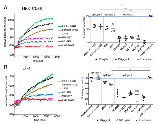 CD38-specific hcAbs MU523 and MU1067 potently inhibit the NGDR cyclase activity of human CD38-expressing tumor cells. The NGDR cyclase activity of CD38 expressing HEK cells (A) and LP-1 myeloma cells (B) was measured by the fluorimetric assay, as described in Figure 1D. Epitopes of daratumumab and hcAbs were assigned as described in [50]. Cells (1 × 105 cells/well) were incubated with the indicated hcAbs (10 μg/mL or 100 μg/mL), daratumumab (20 μg/mL or 200 μg/mL), or araF-NAD (10 µM) for 20 min at 37 °C, before the measurement was started. After the first 20 cycles, 50 μM NGD+ was added and kinetic fluorescence reading (ex/em: 300/410 nm) was continued for 50 min. Cyclase activity was quantified by calculating the slope of curves of (A, B, left panel) during the linear phase, i.e., from t = 500 seconds to t = 1200 seconds (n = 3). Statistical analysis was performed using one-way ANOVA, followed by a Tukey post-hoc test for multiple comparisons. * p < 0.05; *** p < 0.001, **** p < 0.0001.