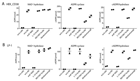 CD38-specific hcAb MU1067 and daratumumab inhibit the ADPR cyclase but not the NAD+ hydrolase activity of CD38-expressing LP-1 myeloma cells. HEK cells (A) or LP-1 cells (B) were pre-incubated for 15 min with the indicated antibodies or araF-NAD at 37 °C, before addition of NAD+ or cADPR, and further incubation for 60 min or 180 min at 37 °C, respectively. Nucleotide concentrations were measured by HPLC as in Figure 1. Toxin-specific L-15-hcAb was used as the control. Dots indicate values obtained in two independent experiments.