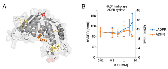 Glutathione enhances the production of cADPR by LP-1 myeloma cells in a dose-dependent manner. (A) Schematic illustrating the disulfide bonds in the extracellular domain of CD38. The five conserved disulfide bonds are depicted in yellow, the non-conserved disulfide bridge at C119/C201 is depicted in red. The N-terminal amino acid of the ectodomain of CD38 is shown in transparent dark red-five amino acids that separate this residue from the transmembrane domain of CD38. NAD+ in the active site crevice is depicted as an orange stick model. The model was made using the Pymol program and the coordinates of human CD38 in complex with NAD+ (pdb 2i65). (B) LP-1 cells were incubated for 10 min with the indicated concentrations of GSH before addition of NAD+ (500 μM) and further incubation for 60 min at 37 °C. Concentrations of ADPR and cADPR in cell supernatants were determined by HPLC, as in Figure 1.
