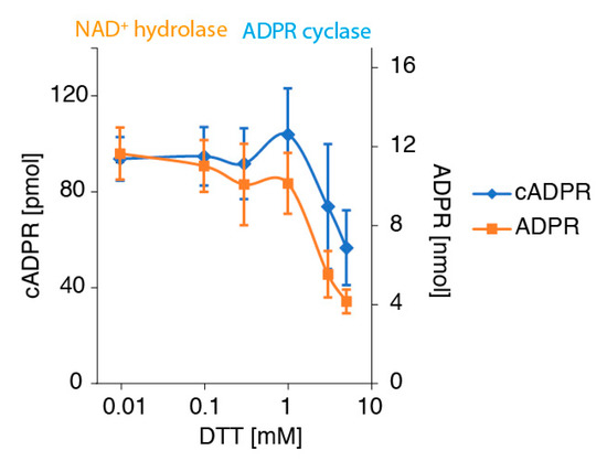 Dithiothreitol (DTT) is a potent reducing agent commonly used in biochemistry to reduce disulfide bonds in proteins, e.g., during denaturing gel electrophoresis. DTT is also used to denature and inactivate CD38 on erythrocytes [55]. Treatment of CD38-expressing tumor cells with DTT, indeed, resulted in a dose-dependent inhibition of the conversion of NAD+ to both, ADPR and cADPR (Figure 5). At an intermediate concentration of 1 mM, treatment of cells with DTT resulted in a slightly elevated production of cADPR, with a concomitant reduction in ADPR, reminiscent of the effects of high concentrations of GSH (Figure 4B).