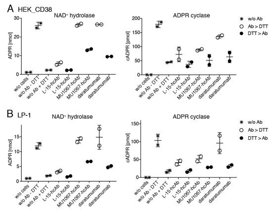 Daratumumab and hcAb MU1067 protect the NAD+ hydrolase and ADPR cyclase activities of the CD38-expressing tumor cells from inactivation by DTT. CD38-transfected HEK cells (A) and LP-1 cells (B) were pre-incubated with 5 mM DTT for 20 min before addition of antibodies and further incubation for 15 min, or vice versa. NAD+ was then added and incubation continued for 60 min at 37 °C. Concentrations of ADPR and cADPR were determined by HPLC, as in Figure 1. Toxin-specific L-15-hcAb was used as control.