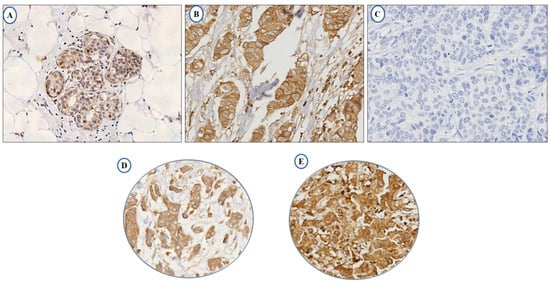The full-face tissue sections demonstrate homogeneous expression of LAIR-1 in BC cells, indicating the suitability of tissue microarrays (TMAs) to evaluate its expression. Normal breast terminal ductal lobular units demonstrate weak LAIR-1 cytoplasmic staining (Figure 1A), while tumour cells reveal slightly increased immunoreactivity (Figure 1B) and Figure 1C represents negative LAIR-1 immunohistochemistry (IHC) expression. LAIR-1 IHC expression predominantly shows cytoplasmic staining with occasional membranous staining in a few tumour cells. This was consistent with Wang et al., who found a similar predominant LAIR-1 cytoplasmic expression in human cervical cancer cells [21]. Cytoplasmic LAIR-1 expression varies from weak to strong as shown in Figure 1D,E. LAIR-1 expression did not follow a normal distribution, therefore for dichotomisation into low/high expression, the median H-score of 120 was used and the expression ranged from 0 to 280 H-score. High expression was observed in (H-score ≥ 120) 51% of the cases and (H-score < 120) 49% of tumours displayed negative/low expression.