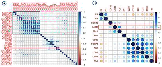 Correlation matrix shows the correlation between LAIR-1, collagens, immune cell markers and tumour-infiltrating lymphocytes (TILs) (A) at mRNA level and (B) at the protein level. Blue colour refers to positive correlations, while the red colour reflects negative correlations. The intensity of the colour propionate to the correlation coefficient.