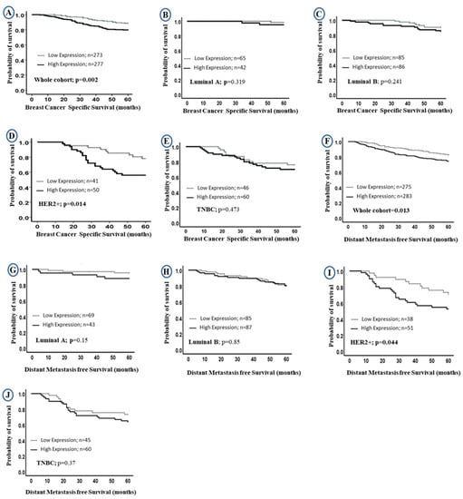 - Fekete, J.T.; Györffy, B. ROCplot.org: Validating predictive biomarkers of chemotherapy/hormonal therapy/anti-HER2 therapy using transcriptomic data of 3,104 breast cancer patients. Int. J. Cancer 2019, 145, 3140–3151. [Google Scholar] [CrossRef]