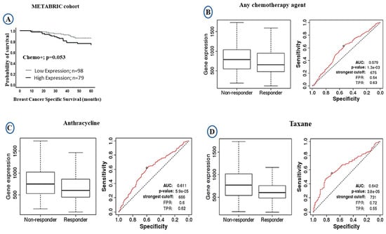 Kaplan-Meier Curves of LAIR-1 expression showing responsive and unresponsive cases to chemotherapy treatment: (A) Kaplan-Meier plots of BCSS in the METABRIC cohort showing LAIR-1 mRNA expression in patients who received chemotherapy. The receiver operator characteristic curve (ROC) in response to chemotherapy showing higher LAIR-1 expression was associated with non-responders ‘groups; (B) any type of chemotherapy agent, (C) anthracycline, and (D) taxane.