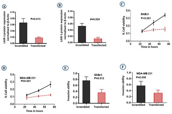 The efficiency of knockdown was evaluated by western blotting (Figure S4C,D). LAIR-1 knockdown expression relative to the β-actin expression was shown to be effective, resulting in almost complete loss of LAIR-1 protein expression in both SKBr3 (Figure 5A; p = 0.013) and MDA-MB 231 (Figure 5B; p = 0.024) cells. As hypothesised, LAIR-1 knockdown reduced cell proliferation in both SKBr3 and MDA-MB 231 (both p < 0.01; Figure 5C,D). Moreover, LAIR-1 knockdown significantly impaired invasion of SKBr3 cell lines (Figure 5E; p = 0.012) with a similar trend observed in MDA-MB 231 cells (Figure 5F; p = 0.058).