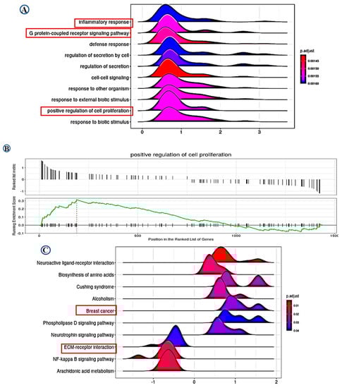 Differential gene expression (DGE) analysis identified 1439 significantly differentially expressed genes associated with LAIR-1 expression, with high LAIR-1 protein expression displaying 773 upregulated and 666 downregulated genes, respectively. Furthermore, applying the over-representation analysis tool (ORA) to perform gene ontology (GO) biological process analysis for DEG associated with upregulated LAIR-1 protein expression were summarised in Figure 6A–C. Gene set enrichment analysis (GSEA) analysis data identified LAIR-1-associated cellular components such as inflammatory response, G protein-coupled receptor signalling pathway and positive regulation of cell proliferation. In addition, GSEA data also revealed an association with LAIR-1 expression and ECM-receptor interaction (Figure 6A,B). Kyoto Encyclopedia of Genes and Genomes (KEGG) pathway analysis further disclosed a series of additional pathways showing strong association with BC, such as Biosynthesis of amino acid pathway, NF-kappa B signalling pathway, Arachidonic acid metabolism pathway, and ECM-receptor interaction pathway (Figure 6C).