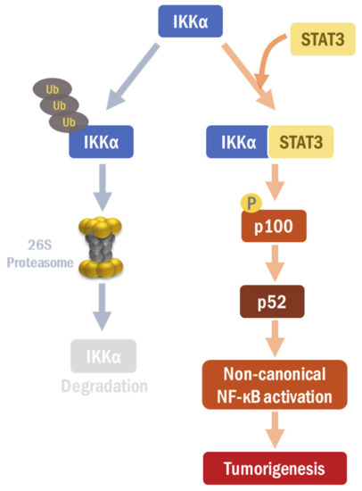 STAT3 stabilizes and up-regulates IKKα expression, responsible for the non-canonical NF-κB activation, in H-Ras MCF-10A cells, exacerbating tumorigenesis (Figure 6). The STAT3-IKKα interaction plays a crucial role for IKKα stabilization, which can provide a novel therapeutic target for breast cancer treatment. Thus, STAT3 could integrate between both distinct NF-κB signaling pathways, which coordinately mediates the inflammation-associated carcinogenesis in human breast carcinomas. However, further studies will be necessary to clarify the molecular and cellular contexts in which STAT3 determines its oncogenic partner between canonical and non-canonical NF-κB pathways.