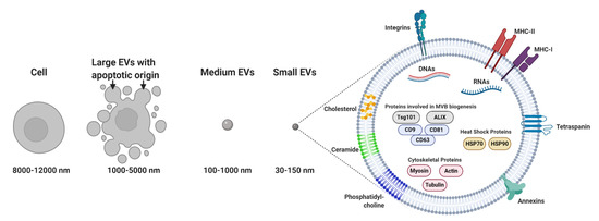 Membrane-bound and heterogeneous extracellular vesicles (EVs) were initially considered anecdotal examples of cell debris or apoptotic bodies released by the majority of cells [1]. EVs are now regarded as key diagnostic tools [2,3,4] and therapeutic agents [5]. EVs facilitate communication processes between near and distant cells. In addition, these vesicles can be grouped into two major categories: (a) microvesicles (MVs; 100–1000 nm), considered to be functional liposomes composed of molecules such as nucleic acids, proteins and functional lipids surrounded by a lipid bilayer and (b) exosomes (EXOs; 30–150 nm) (Figure 1) [6], which differ from MVs in their size, protein composition, buoyant density, release mechanism and potential physiological role [7,8,9,10]. In this review, we will focus mainly on exosomes, with particular emphasis on their composition. We will discuss their potential role in signaling under both physiological and different pathological conditions. Special attention will be paid to the therapeutic role of exosomes as delivery vectors, as well as their potential use as biomarkers and in clinical interventions.