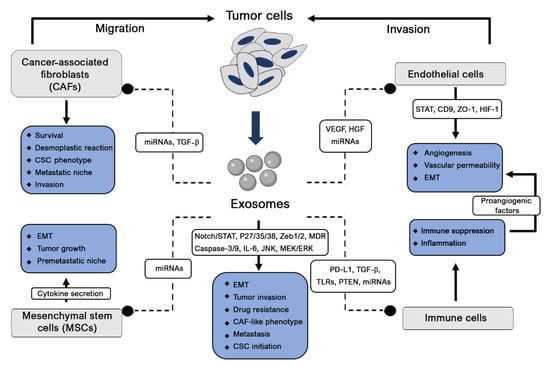 Cancer is a genetic and irreversible change due to the activation of specific oncogenes, inactivation of tumor-suppressive genes or other genes involved in genome stability. The evolution of these cancer cells is the result of dual interactions between cancer cells and their surrounding microenvironments. Inflammation is considered the driving initiator of tumor development. Exosome integrins are reported to upregulate S100 proinflammatory molecules, probably by activating and phosphorylating SRCs [48]. Additionally, tumor cells induce the secretion of inflammatory factors, including VEGF, tumor necrosis factor-α (TNF-α), TGF-β and interleukins, to stimulate myeloid cells and immune cells to migrate, thus amplifying inflammatory factor secretion [49]. The immune response is prevented later after the programmed death receptor (PD-1) expressed on activated T and B cells and macrophages binds to its ligand, PD-L1, inducing T-cell apoptosis and inhibiting T-cell activation and proliferation [50,51]. Tumor-associated macrophages (TAMs), T-regulators and myeloid-derived suppressor cells are also recruited to the tumor to inhibit the immune response [52,53]. This immune suppression phase is followed by the improvement of angiogenesis and vascular permeability. In this case, MSCs and endothelial cell interactions mediated by Akt phosphorylation lead to the formation of a vascular microenvironment [54]. By expressing E-cadherin and carbonic anhydrase-9 (CA-9) on their surfaces, exosomes also promote angiogenesis [55,56]. Additionally, integrins (ITGs) present on their surfaces determine organotropism, and their different expressions are organ-specific [48]. These ITGs colocalize specifically with ECM components (laminin or fibronectin) whose composition is modulated by fibroblasts and endothelial cells, suggesting that exosomes drive the colonization of tumor cells by remodeling the stromal microenvironment of the target organ. Mesenchymal stem cells (MSCs) are part of the tumor microenvironment [57], where they are educated and transformed through the release of exosomes into tumor-supportive myofibroblasts, leading to cancer initiation [58].