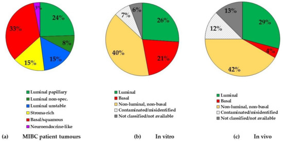Comparison of muscle-invasive bladder cancer (MIBC) subtype frequency in patient tumours and human bladder cancer (BCa) cell lines used in radiotherapy (RT) experimental studies in vitro and preclinical studies in vivo. (a) MIBC tumour subtypes (classified by [36]); (b) cell line subtypes used in experimental studies of RT in BCa in vitro (classified by [46]); (c) cell line subtypes used in preclinical studies of radiotherapy in BCa in vivo (mice xenografts) (classified by [46]).