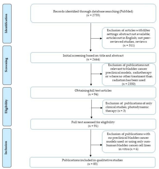 The titles and abstracts of the obtained studies were further screened independently by L.S. and F.M. and excluded on the basis of following criteria: (1) no experimental models of bladder cancer used, (2) radiotherapy treatment not used or used as a single treatment. The lists were compared and the publications for which the two reviewers had a disagreement were reviewed together and, when needed, discussed with the third reviewer (F.M.C.). Then, the full text was obtained and assessed for eligibility, excluding only clinical studies and studies using photodynamic therapy. After careful reviewing of each full text article, additional studies were excluded where the experimental model used was only non-human BCa cell lines in vitro. The flow chart showing the numbers of the initial studies identified in PubMed and the steps leading to the final inclusion of 85 studies are depicted in Figure 2.
