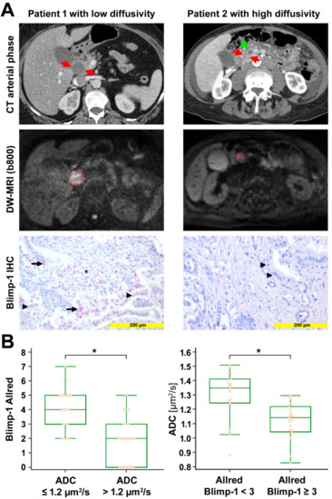 Radio-pathological correlation. (A) Left column: Representative images from a patient with low diffusivity. Late arterial phase computed tomography (CT) image shows the hypodense tumor in the head of the pancreas (red arrows). Diffusion-weighted image (DWI) with the volume of interest (VOI, red) from radiologist 1 encompassing the markedly hyperintense tumor (b = 800 s/mm2). Mean apparent diffusion coefficient (ADC) value for both radiologists was 0.875 µm2/s. Anti-Blimp-1 immunohistochemical staining shows pancreatic cancer tissue with partial Blimp-1 expression in moderate intensity (red nuclei; arrow); Blimp-1 Allred score was 5 in this example. Negative nuclei are marked with arrowheads. Blimp-1 infiltrated immune cells in the tumor stroma, marked by an asterisk. Right column: Representative images from a patient with high diffusivity. Late arterial phase CT image shows the hypodense tumor in the pancreatic head (red arrows). The pancreatic duct is dilated in the upstream parenchyma (green arrow). DWI with the VOI (red) from radiologist 1 encompassing the mildly hyperintense tumor (b = 800 s/mm2). Mean ADC value for both radiologists was 1.509 µm2/s. Anti-Blimp-1 immunohistochemical staining shows pancreatic cancer tissue without nuclear Blimp-1 (blue nuclei; arrowheads). (B) The box-and-whisker plots show the distribution of Blimp-1 Allred scores relative to ADC values (left) and the distribution of ADC values relative to Blimp-1 Allred scores (right). ⃰, p < 0.05.