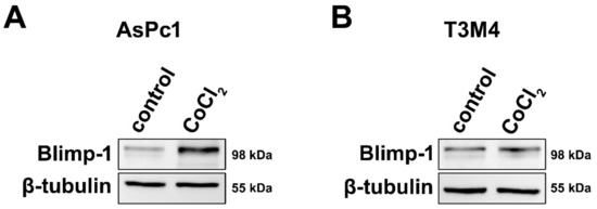 To assess a molecular link between hypoxia and Blimp-1 expression and to provide evidence for its reliability as a hypoxic marker, pancreatic tumor cells were cultivated in a medium containing Cobalt(II)chloride (CoCl2), a widely used and well-established molecular model mimicking hypoxia in cell culture [35]. Two different pancreatic cancer cell lines were used because due to their different origin and differentiation status, their response to hypoxia might vary. In both cell lines, an upregulation of Blimp-1 (n = 6) was detected at the protein level, but more pronounced in AsPc1 (2.01-fold, p = 0.025, paired samples t-test) and very slight—though reproducible—in T3M4 (1.12-fold, p = 0.527, paired samples t-test) compared to the untreated group (Figure 2). Further experiments indicated a possible involvement of the ERK pathway in Blimp-1 regulation (Figure S2), as previously described [18].