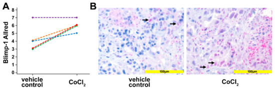 To corroborate the in vitro data, human pancreatic cancer tissue was used in an ex vivo culture system. Tissue slices of human pancreatic cancer samples, generated from surgical specimens of individual patients (n = 5) were treated for 24 h with 200 µM CoCl2 to induce a hypoxic micromilieu. Upregulation of Blimp-1, as a reliable marker of hypoxia, in the nucleus could be detected in 4 out of the 5 samples (p = 0.037, paired samples t-test) by immunohistochemistry (Figure 3). The median Allred immunoreactivity score in the untreated group was 4/8, in the treated group 6/8.