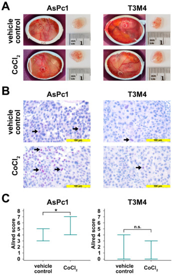 Avian xenografts model. (A) The three-dimensional growth of AsPc1 cells (treated, n = 7; untreated, n = 5) and T3M4 cells (treated, n = 4; untreated, n = 3) inoculated on the chorioallantoic membrane (CAM) of fertilized chicken eggs and the harvested tumors from vehicle control and after treatment with CoCl2 were photographed at day 17 of embryonic development. Tumor volumes and weights were not significantly different between vehicle control and CoCl2-treated xenograft tumors. (B) Anti-Blimp-1 immunohistochemical staining of vehicle control CoCl2-treated resected xenograft tumors. There was a significant induction of Blimp-1 expression following treatment with CoCl2 in AsPc1 cells, but not in T3M4 cells. (C) Quantification of Blimp-1 expression in xenograft tumors. Markers indicate the range of Blimp-1 Allred scores. For AsPc1 cells, Blimp-1 Allred scores were significantly higher CoCl2-treated than for vehicle control xenograft tumors. No significant difference in Blimp-1 Allred scores was observed for CoCl2-treated T3M4 xenograft tumors compared to vehicle control. n.s., not significant; *, p < 0.05.