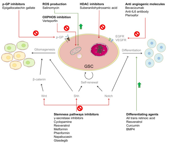 Due to their dormant state, GSCs are intrinsically resistant to conventional chemotherapeutics that act on rapidly proliferating cancer cells, such as alkylating agents, antimetabolites, and mitotic inhibitors. Furthermore, they can actively resist chemo- or radiotherapy by the activation of checkpoint mechanisms, in order to recover efficiently from the genotoxicity induced by the therapy. Another mechanism of resistance for GSCs is the expression of drug efflux mechanisms (ABC transporters) to protect the cells from xenogeneic molecules [13]. Autophagy, which is required for stemness maintenance, not only in normal tissue stem cells but also in GSCs, has been shown to contribute to therapy resistance [14]. Moreover, the Notch signaling pathway is involved in the resistance of GSCs to radiotherapy. The inhibition of this pathway through γ-secretase inhibitors is able to induce radiosensitivity by targeting the subpopulation of cells that bears the GSC marker CD133 [15].