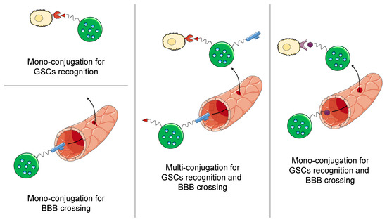Several authors developed multifunctional nanocarriers by combining the targeting of GSCs and the crossing of the BBB. TMZ-loaded liposomes were conjugated with an anti-CD133 antibody for targeting GSCs and angiopep-2 for BBB crossing. Angiopep-2 can bind to the low-density lipoprotein (LDL) receptor-related protein, which is highly expressed on the endothelium of the BBB. This system was able to bind to GSCs more efficiently than the nontargeted system, and showed an increased permeability of the BBB in vitro. Moreover, the dual-targeted liposomes were able to decrease the tumor size and prolong the mice survival in the orthotopic, in vivo GSC model [90]. Paclitaxel and surviving siRNA-loaded liposomes were also conjugated with an anti-CD133 aptamer for targeting GSCs and Angiopep-2 for crossing the BBB. Targeted liposomes had an improved uptake in cancer stem cells compared to the nontargeted ones. Moreover, while Taxol and nontargeted liposomes had almost the same effect, targeted liposomes produced a significant decrease in the cell viability of CD133+ cells. The formulation was also able to significantly reduce tumor growth and prolong mouse survival in vivo [83].