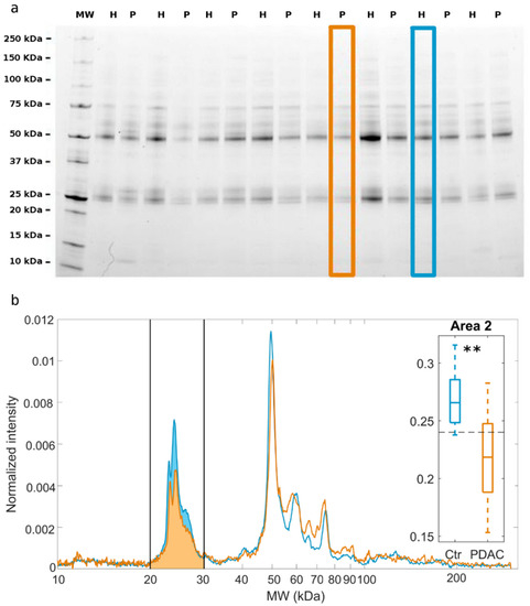 (a) Following exposure of graphene oxide (GO) sheets to human plasma, a protein corona forms. After protein corona isolation by centrifugation and protein corona analysis by 1D SDS-PAGE, an image of the gel is obtained. In the gel image, each lane refers to the protein profile from a single human subject, being either a pancreatic ductal adenocarcinoma (PDAC) patient (P) or a healthy volunteer (H). (b) 1-dimensional (1D) profiles were obtained by densitometric analysis of the two lanes that are indicated with orange (P) and blue (H) solid boxes in panel a. Black vertical solid lines identify a region of molecular weight between 20 and 30 kDa, hereafter indicated as Area 2, where the largest difference between the two 1D profiles is observed. A boxplot of the computed Area 2 for all the processed samples (34 PDAC vs. 34 healthy subjects) is reported in the inset. Whiskers span from the minimum to the maximum measured values, and boxes indicate the 25th–75th percentile range and horizontal segments represent the median values of the distributions. ** indicate a Student p-value < 0.001.