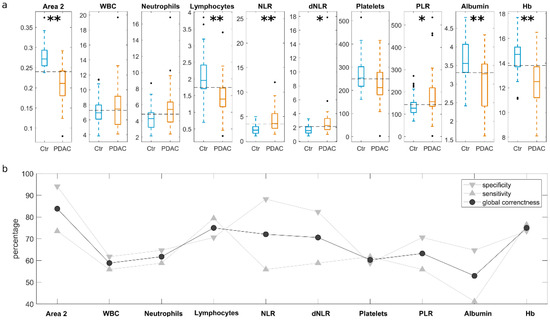 (a) Boxplots of electrophoretic and clinical parameters for PDAC patients (orange) and control (i.e., non-oncological) subjects (blue) sample distributions. Whiskers span from the minimum to the maximum measured values, and boxes indicate the 25th–75th percentile range and horizontal segments represent the median values of the distributions. Asterisks correspond to Student’s t-test p-values: * p < 0.05; ** p < 0.001. (b) Specificity, sensitivity and global correctness of the test’s discrimination ability for each of the investigated parameters.