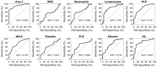 However, results reported in Figure 2b reveal that predictive values offered by laboratory tests and SIRBs were still lower than the positive predictive value of Area 2. This trend was confirmed by receiving operative curve (ROC) analysis and the corresponding AUC values, which were computed for all the employed parameters. As shown in Figure 3, Area 2 reached the largest AUC (0.91), followed by Hb (AUC = 0.83).