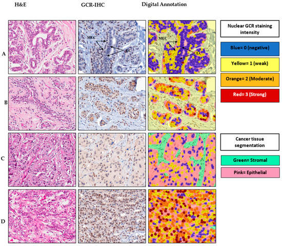 Immunohistochemical staining and digital output images for glucocorticoid receptor (GCR) in representative cases. For each case, H&E and the corresponding anti-GCR IHC image and digital analysis output are shown. (A) Normal breast tissue, (B) fibroadenoma, (C) ductal carcinoma and (D) lobular carcinoma. LC, luminal cells; MEC, myoepithelial cells.